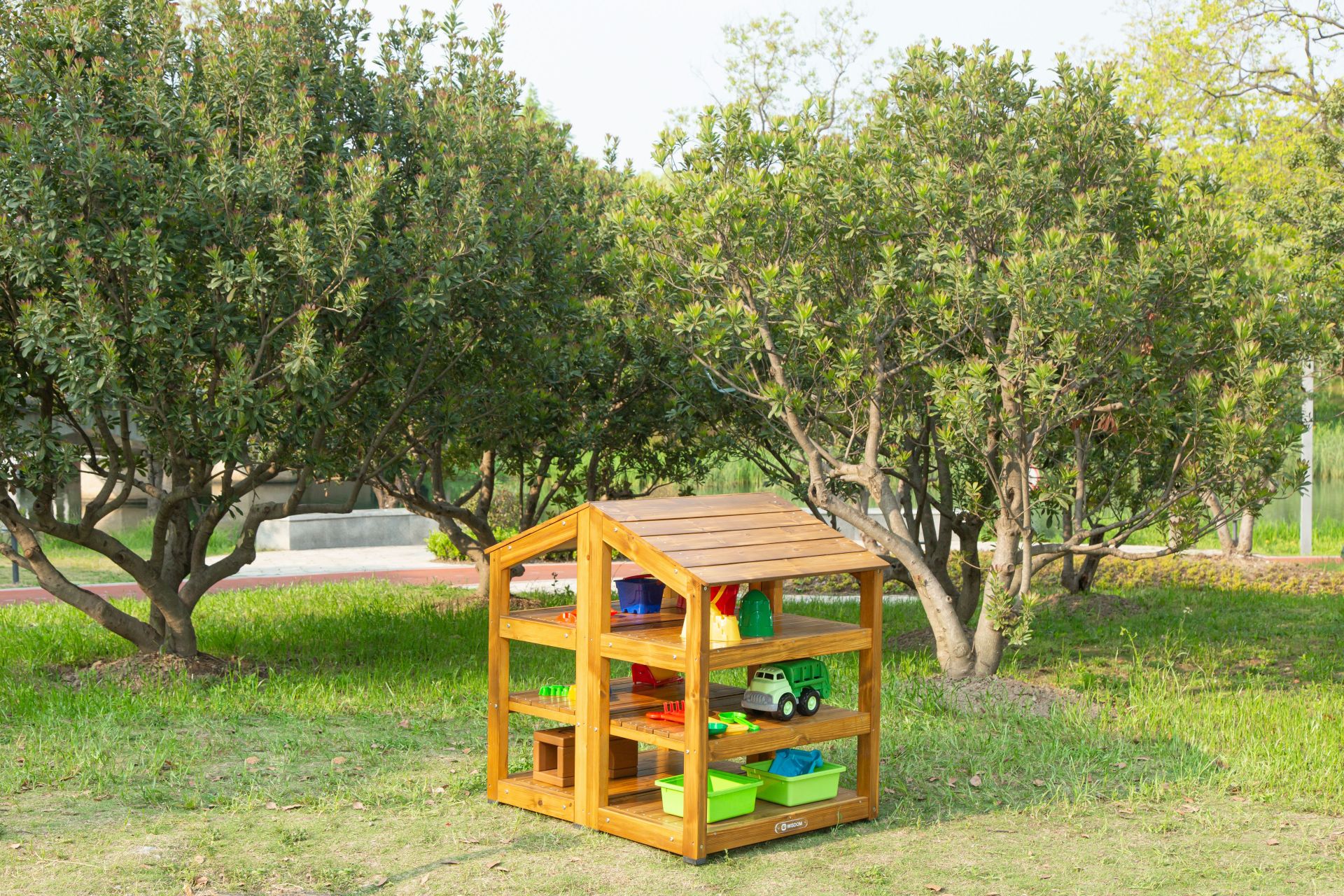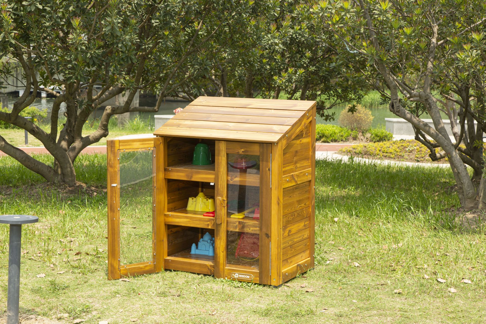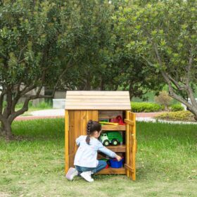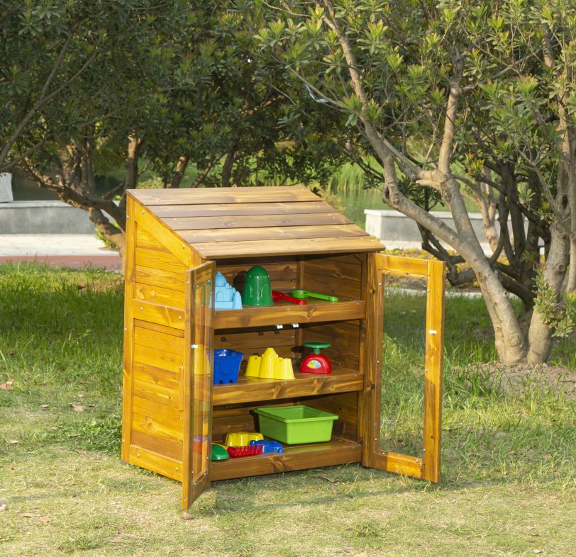 Deze stevige buitenkast is perfect geschikt voor gebruik in kinderdagverblijven. Met zijn glazen deuren kunnen kinderen snel en gemakkelijk hun speelgoed en materialen zien en pakken. De kast is gemaakt van weerbestendig behandeld hout. Dankzij het schuine dak zijn de opgeslagen materialen bijzonder goed beschermd tegen regen en zon.