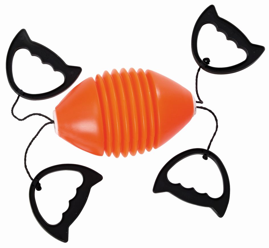 Gewoon de handvaten vastnemen en wegstappen van je partner tot de touwen gespannen zijn, dan de armen spreiden en ′swoosh′ de bal naar je partner.
