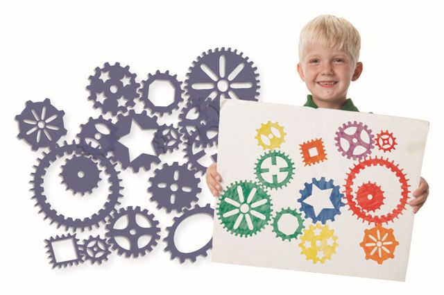 Tandwielen zijn de wetenschap in beweging! 15 in elkaar grijpende tandwielstencils vertegenwoordigen ronde, vierkante en ovale tandwielen, waardoor de kunstenaar (of ingenieur!) ze in elkaar kan passen om een mechanisch meesterwerk te creëren. De set bestaat uit 15 stencils variërend van (7,5-23 cm) en een handleiding.