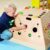 Zijde 2: Roterende wand met belletjes, noppenplaat, aangrijpende groeven en gaten voor sleutels, drie roteerbare houten wielen
