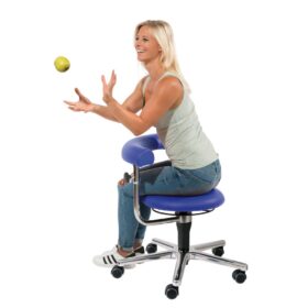 De hoogte van de zitting en de rugleuning zijn verstelbaar. De rugleuning kan onafhankelijk van de zitting 360 ° worden gedraaid. De zitting en rugleuning zijn bekleed met een afveegbare kunstlederen bekleding in blauw of rood.