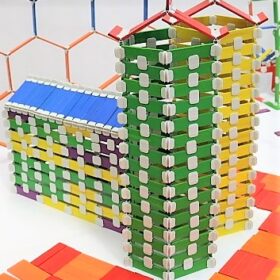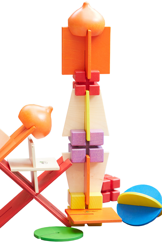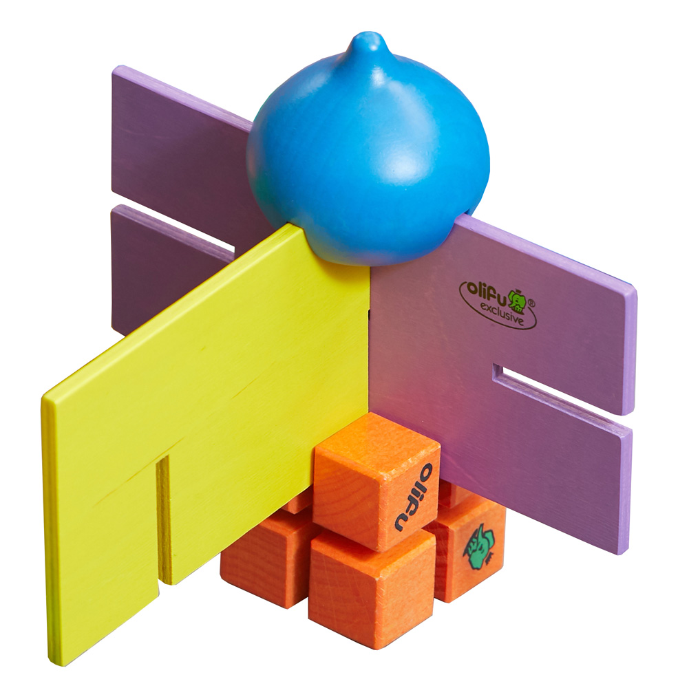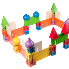 – 8 hoge ronde houten torens (4 paars, 4 geel)