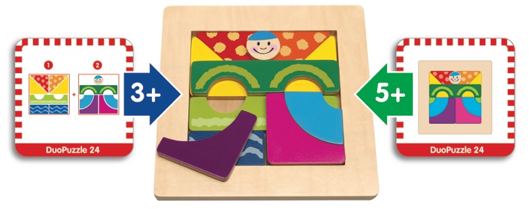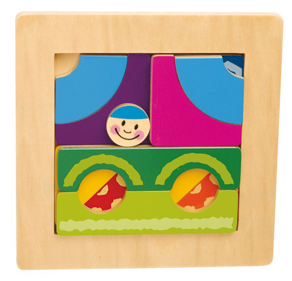 Een logisch denkspel voor jonge kinderen waarbij ze de puzzelstukken in 2 lagen op elkaar leggen om de oplossing te vinden. Dit spel is geschikt voor jonge kinderen vanaf 3 jaar en iets oudere kinderen.