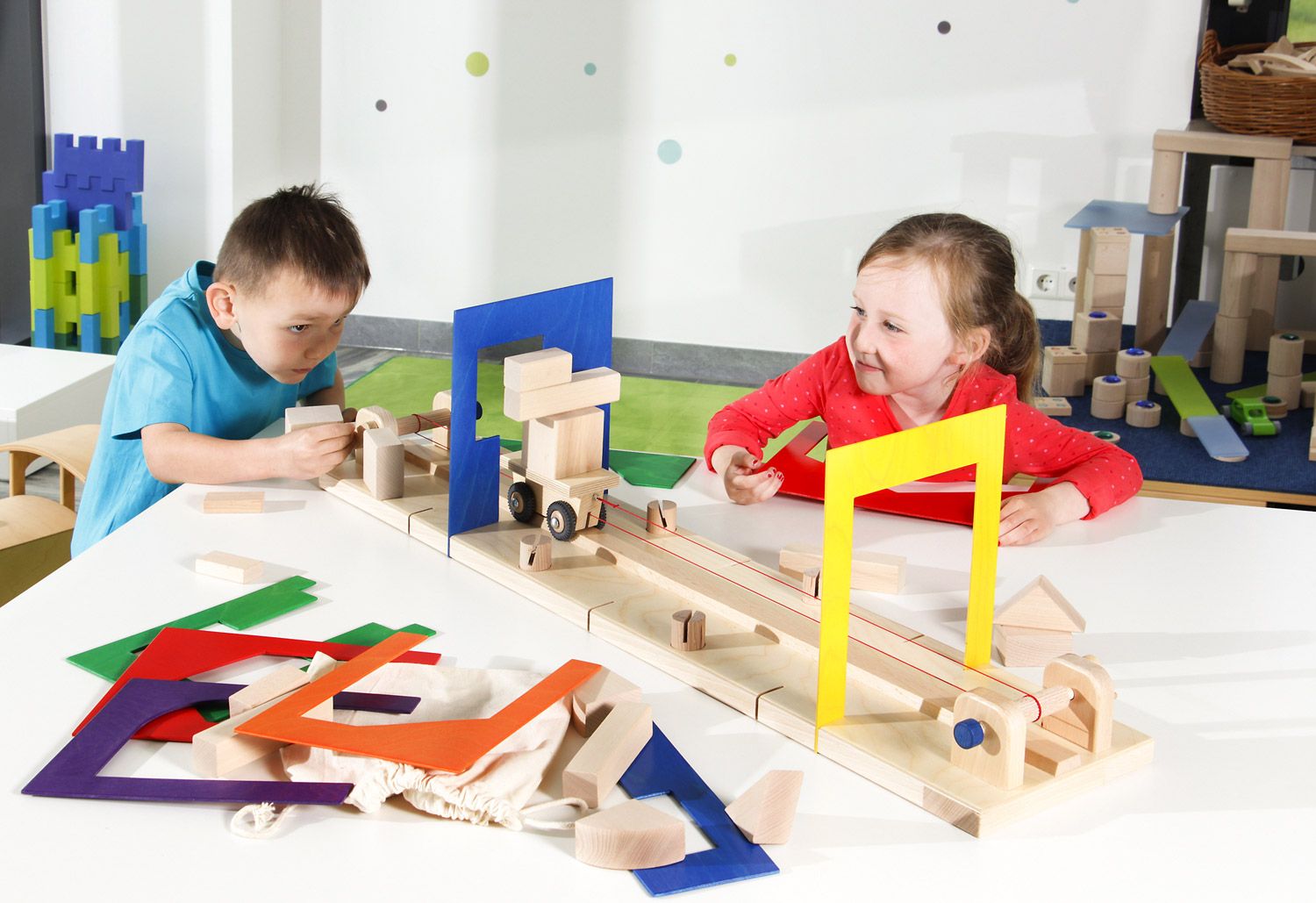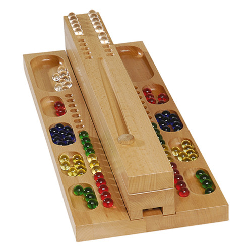Knikkerdoos gemaakt van massief beukenhout, geverfd (55 x 22 x 9 cm), 270 glazen knikkers in 5 kleuren, 1 houten stop, spelinstructies.
