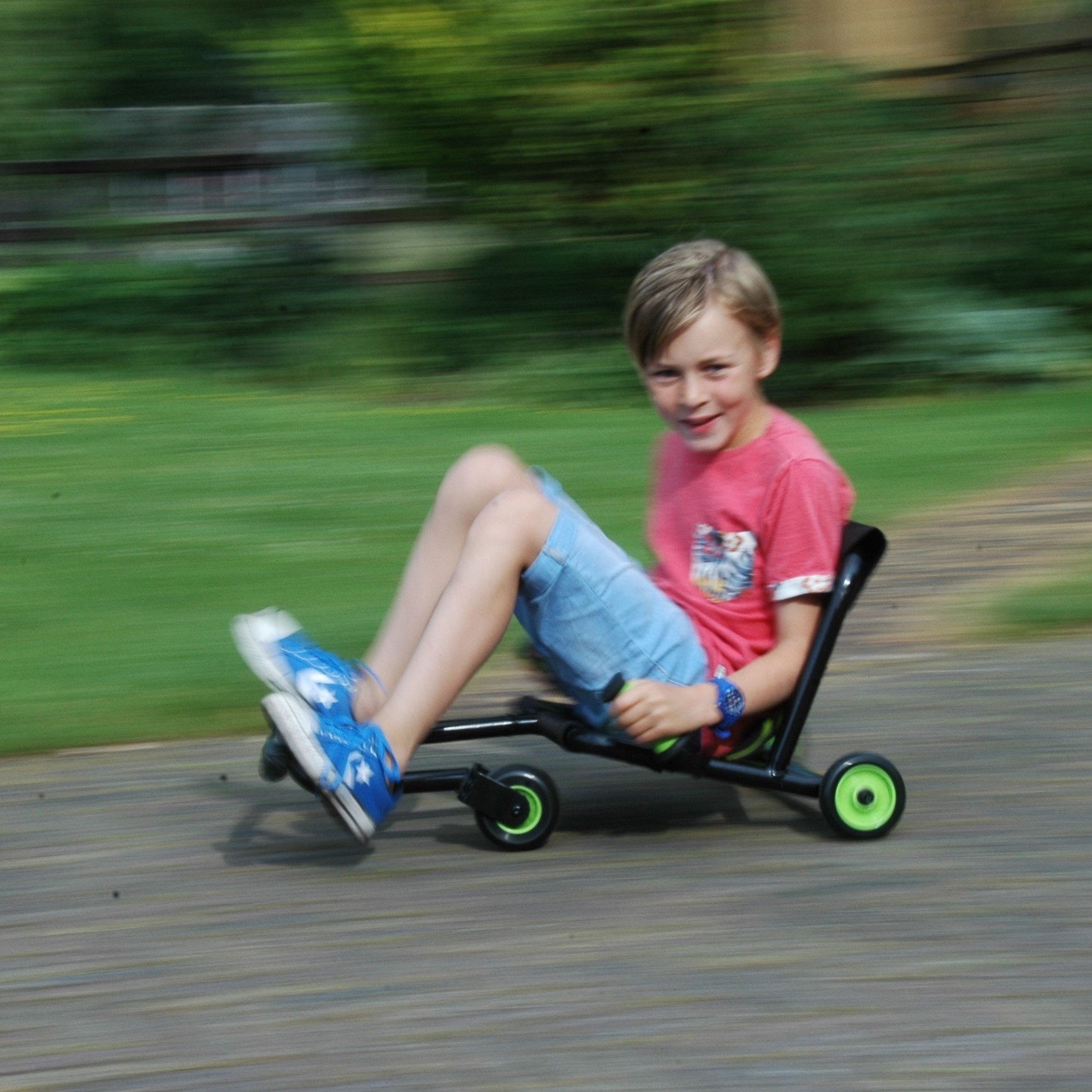 Thomas (6 jaar): "Je kan er gave bochten mee maken". De Bikez Racer is geen gewone trapskelter. Je komt vooruit door je voeten afwisselend heen en weer te bewegen. Zo maak je snelheid en je handen gebruik je ook om te sturen. Het vraagt een en ander van je motoriek en van de oog-hand-coördinatie en dat is een extra uitdaging. Deze Olifu Bikez Racer is echt geweldig.