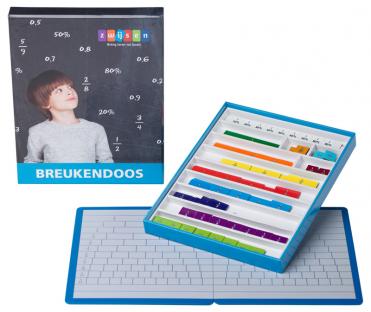 De breukendoos bevat 2 breukenborden, verschillende breukenstroken, een kommagetallenstrook en een procentenstrook.